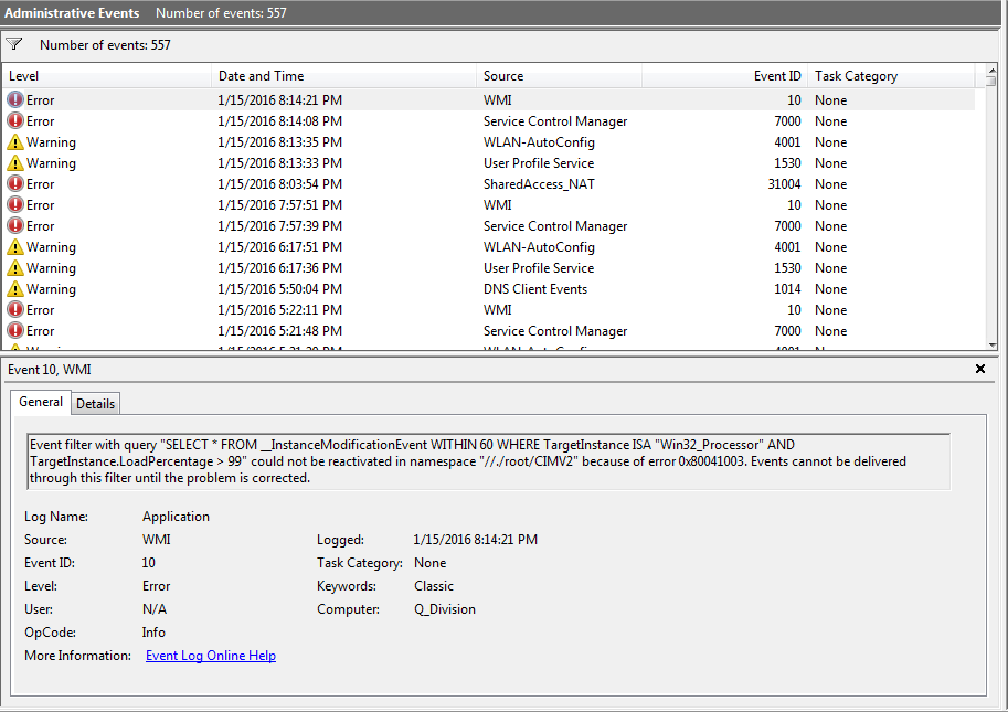 Полное сообщение об ошибке для этой проблемы: «Фильтр событий с запросом« SELECT * FROM __InstanceModificationEvent WITHIN 60, ГДЕ TargetInstance ISA «Win32_Processor» И TargetInstance.LoadPercentage> 99? не удалось повторно активировать в пространстве имен «//./root/CIMV2» из-за ошибки 0x80041003. События не могут быть доставлены через этот фильтр, пока проблема не будет устранена