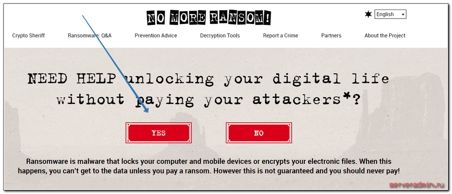 Вопрос простого и надежного дешифратора встает в первую очередь, когда дело касается вируса-шифровальщика. Первое, что я посоветую, это воспользоваться сервисом https://www.nomoreransom.org. А вдруг вам повезет у них будет дешифратор под вашу версию шифровальщика CRYPTED000007. Скажу сразу, что шансов у вас не много, но попытка не пытка. На главной странице нажимаете Yes: