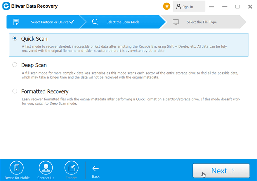 Шаг 3: ВыбратьРежим сканированияи нажмите наСледующийкнопка.