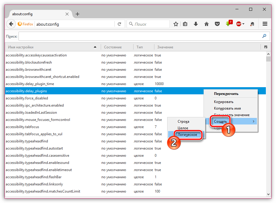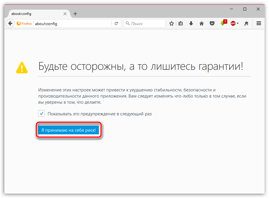 Открыть about: config в адресной строке Firefox.