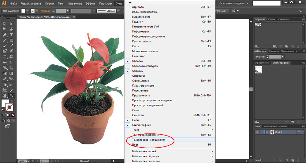 Например, в векторном редакторе Adobe Illustrator для этих целей предусмотрена отдельная опция. Чтобы перевести картинку в вектор открываем её в редакторе, выделяем её мышкой, после чего в верхнем меню выбираем «Окно» -> «Трассировка изображения».