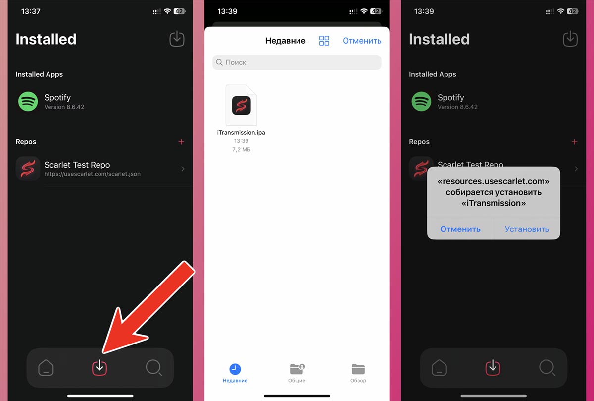 ◈ Во втором случае нажмите среднюю кнопку в нижней панели и добавьте загруженный файл в формате *.ipa, который будет подписан и установлен после импорта в Scarlet.