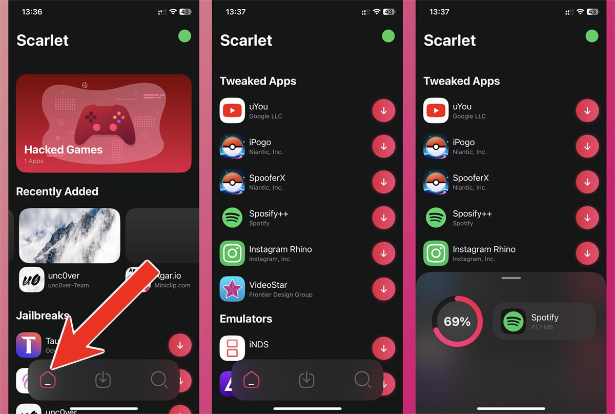 ◈ В первом случай откройте основную вкладку приложения Scarlet, найдите программу в каталоге и подтвердите установку на смартфон.