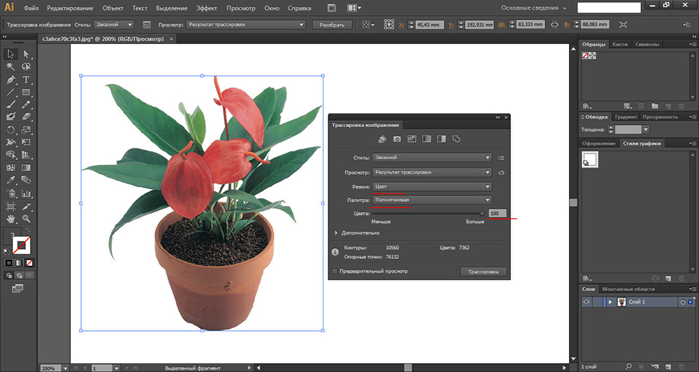 Для создания же максимально реалистичного изображения следует выбирать пресет «Фотография высокой точности». Вместо этого также можно установить максимальное значение для параметра «Точность цвета» с помощью ползунка, при этом остальные параметры будут подобраны автоматически. Перед тем как запустить процесс векторизации убедитесь, что режим по-прежнему выставлен «Цвет», а палитра «Полнотоновая». Нажмите кнопку «Трассировка» и дождитесь завершения процесса преобразования.