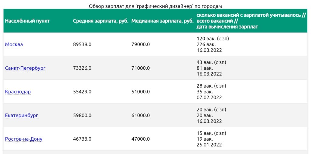 Обзор зарплат графического дизайнера по городам в феврале и марте 2022 года. Источник