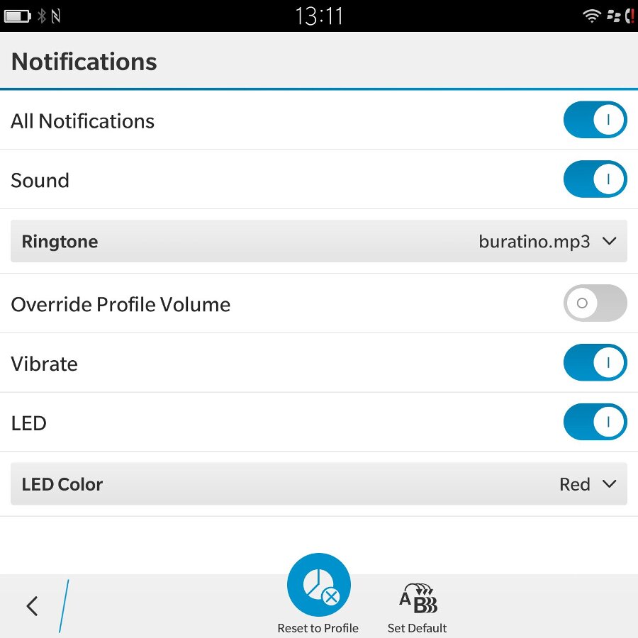 В BlackBerry 10 совершенно потрясающе настраиваются уведомления. На каждый чих можно сделать свою уникальную реакцию устройства, настроив звуки и вибрацию, а также цвет светодиодного индикатора. Более того, уведомления можно еще и группировать в профили — например, разрешив в ночное время звук только для телефонных звонков (или только от избранных контактов). Впрочем, «ночным режимом» профили далеко не ограничены: с помощью сторонних приложений (работающих, нужно отметить, в фоновом режиме) их можно переключать в зависимости от… да практически от чего угодно, на что хватит фантазии.