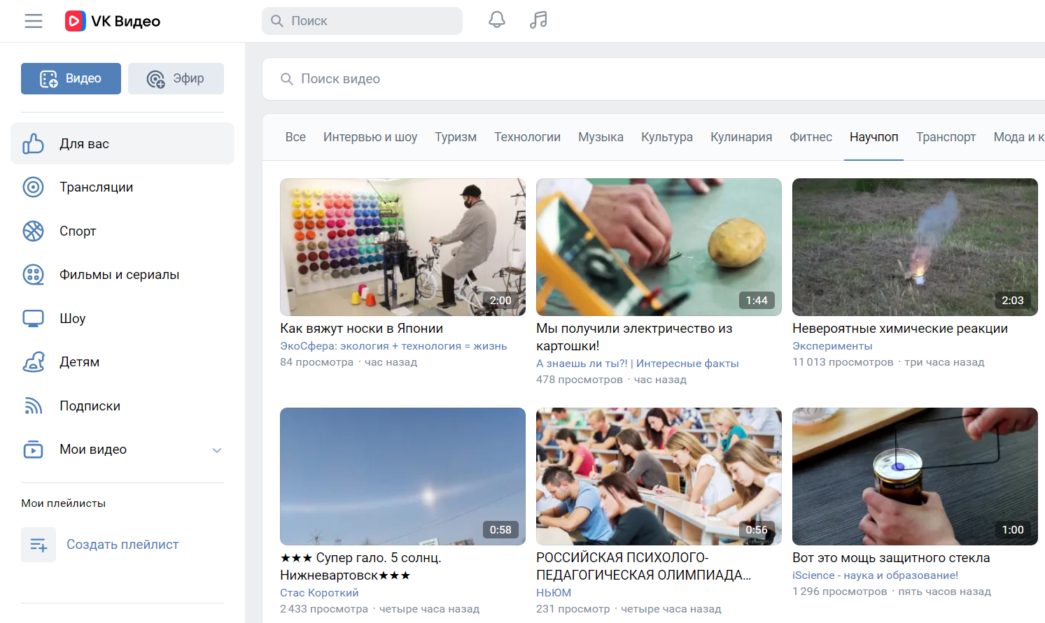 Особой похвалы заслуживает навигация в VK Видео. Раздел поделен на категории «для вас», «трансляции», «детям», «популярное» и многие другие. А в окне «Фильмы и сериалы» можно смотреть кино, многосерийные шоу, дорамы и мультфильмы. Классификация по тегам помогает найти интересный юзеру контент, будь то интервью или спортивные соревнования. Удобный интерфейс с отсортированным материалом — однозначный плюс в пользу хостинга.
