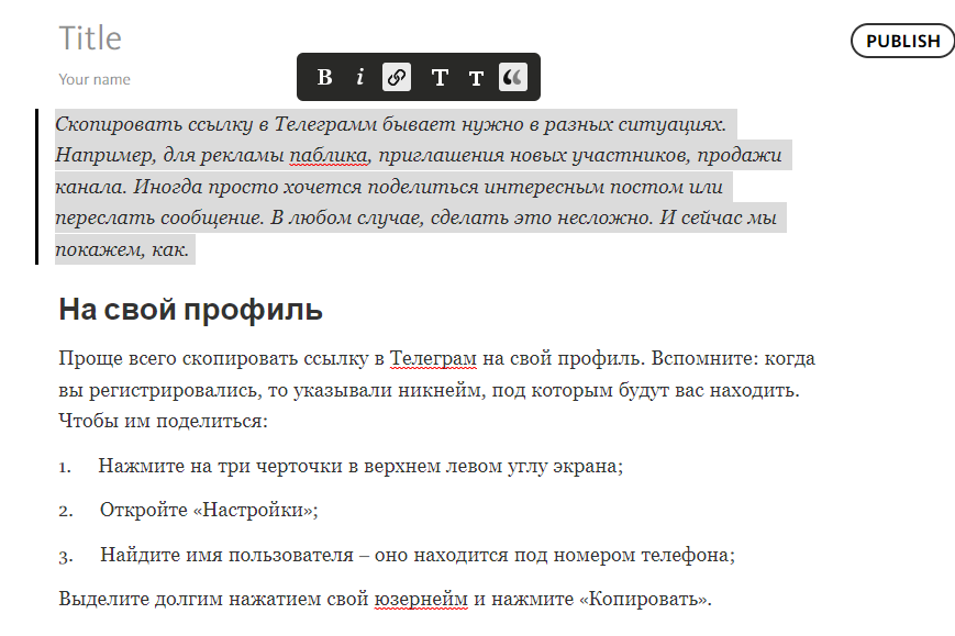 Для добавления статей в Телеграм был разработан специальный сервис под названием telegra.ph. Он доступен еще с 2016 года, но многие пользователи до сих по не знают о его существовании.