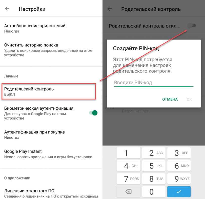- Там же настраиваем функцию «Родительский контроль». Для этого берём телефон ребёнка и заходим в Google Play. Набираем «Настройки» — там будет отдельная кнопка «Родительский контроль». Задаем пин-код. Ребенку говорить пин-код нельзя, иначе он сам сможет отключить эту функцию. «Родительский контроль» позволяет выставить ограничения по возрасту — детям не будут показываться «взрослый» контент».