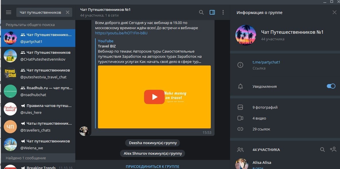 Однако нужно отметить, что именно просмотр результатов при работе с ПК удобнее, так как при нажатии на название сообщества вы сразу видите всю информацию о нем (блок справа от окна чата).
