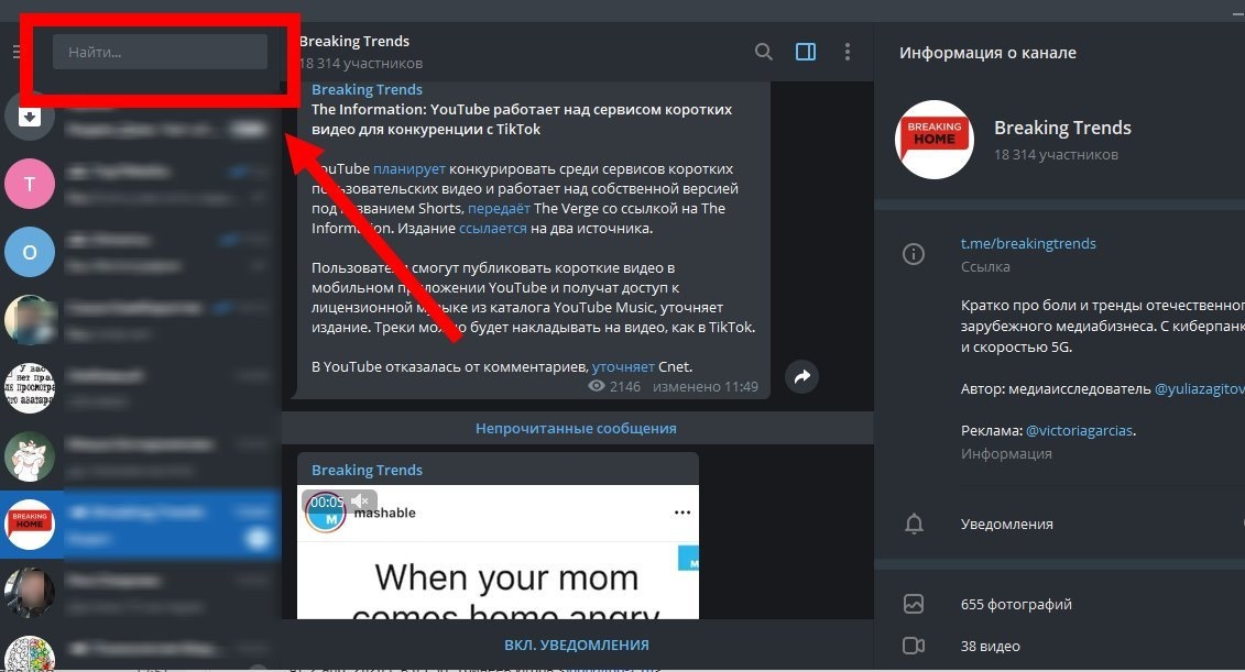 Чтобы найти канал в ТГ на мобильном, следует ввести в поиск название аккаунта или ссылку через @.