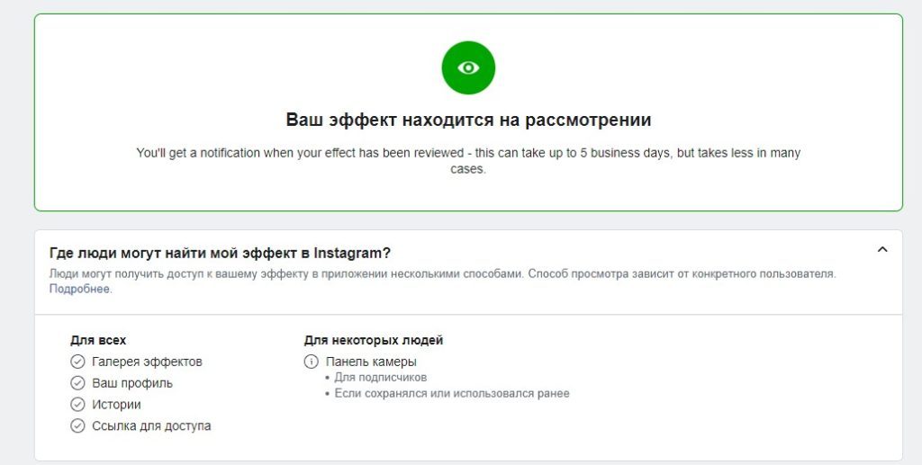 Как только вы нажмете кнопку «Отправить на рассмотрение», ваш эффект будет отправлен на модерацию. Перед вами появится такая страничка.