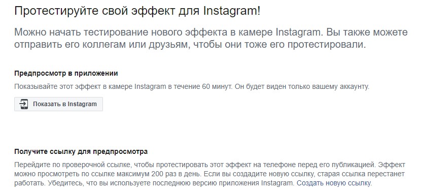 4. Выберите кнопку Показать эффект в Instagram. Теперь вы сможете протестировать его в Инстаграме, а также его могут протестировать и ваши друзья.