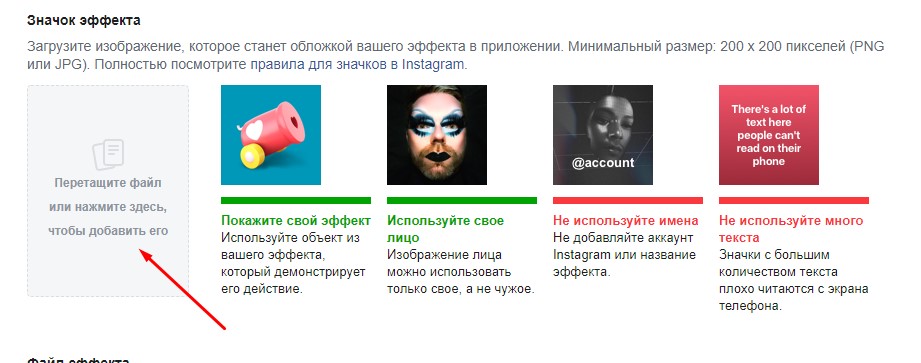 2. На новой странице выбираем иконку для своего эффекта. Желательно добавить фото своего лица с этим эффектом, для демонстрации. На иконке не должно быть названия вашего профиля Instagram, названия самого эффекта. Текста на картинке должно быть немного.
