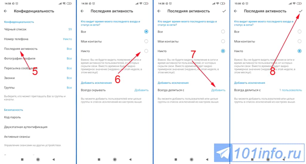Большинство мессенджеров позволяют только включить или отключить функцию отображения времени. В Telegram предусматриваются дополнительные настройки. В частности, приложение позволяет очертить круг лиц, которые могут видеть, когда пользователь в последний раз запускал мессенджер. Остальным участникам сообщества доступ к этой информации останется скрытым.