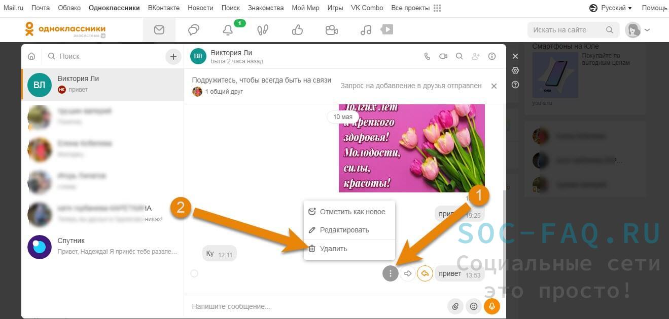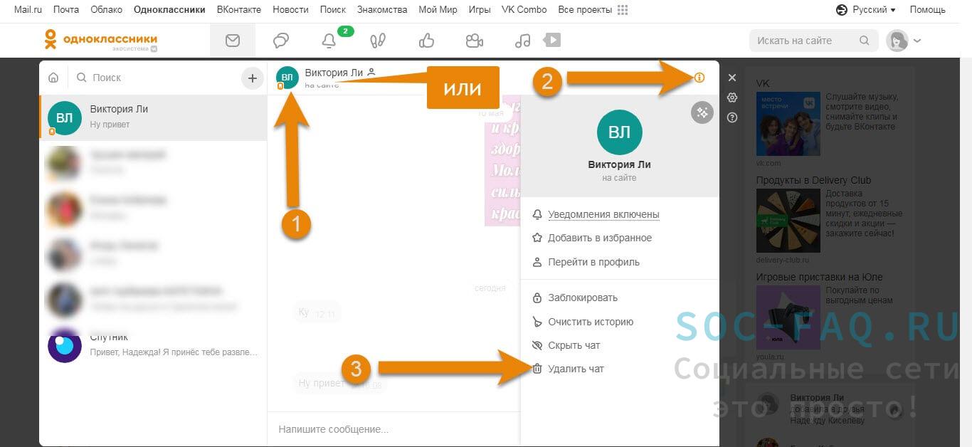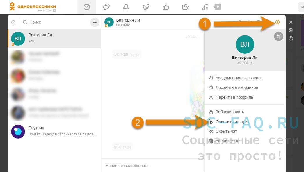 В ОК есть два способа удаления диалога: Первый, очистить сообщения только у себя, например если в вашей переписке есть то, что нужно удалить, вы можете воспользоваться такой опцией. Выбираете ненужное сообщение, наводите на него курсор мыши, рядом всплывает меню, из него выберете «Удалить». Затем открывается окно, нажимаете «Удалить».