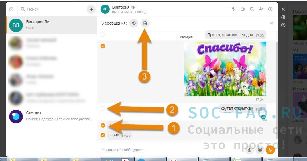 Ещё можно удалить, не входя в меню. Войдите в переписку с пользователем, слева от сообщений есть точки, нажмите на них напротив тех сообщений, которые вы хотите «ликвидировать», их может быть бесконечное количество. Над чатом под фото вашего собеседника появятся 2 кнопки, одна из которых «Корзинка», нажмите на неё и подтвердите удаление.