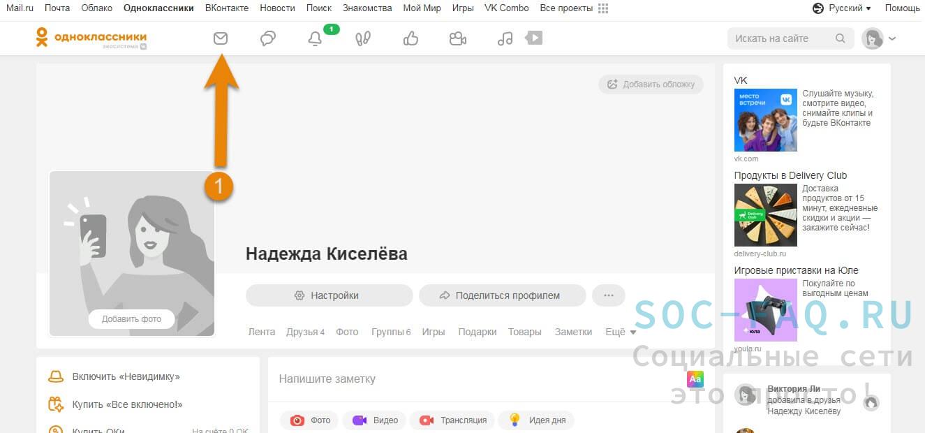 В верхней шапке вашего профиля находится значок «Письмо». Нажмите на него, в левом блоке откроется список диалогов, выберите тот, который вы хотите почистить.