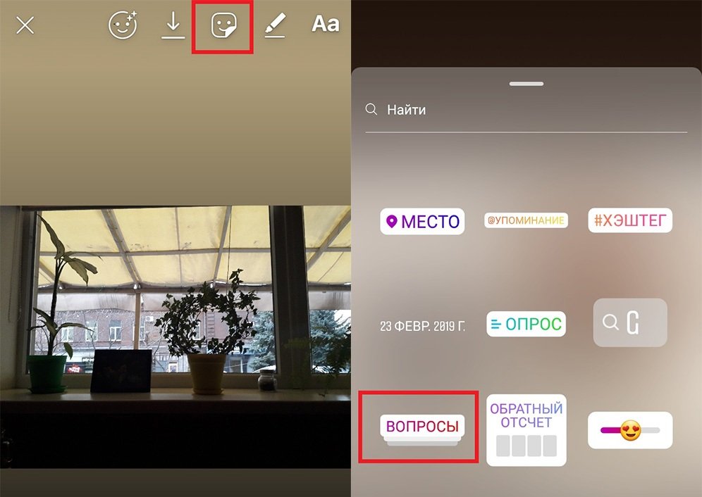 После того, как с фоном определились, рассказываю, как пользоваться стикером. Итак, нужно нажать на наклейку в правом верхнем углу и выбрать стикер «Вопросы».