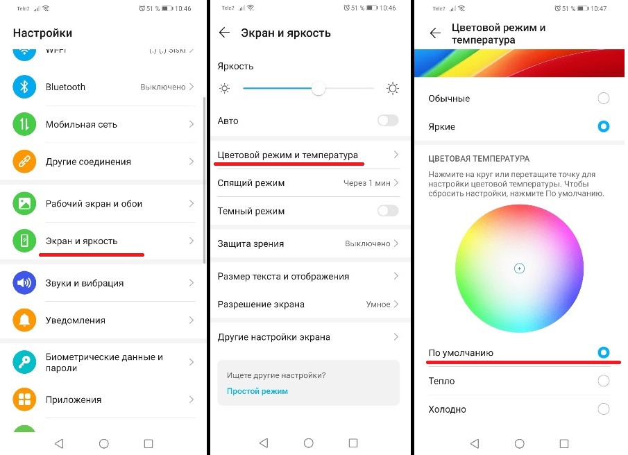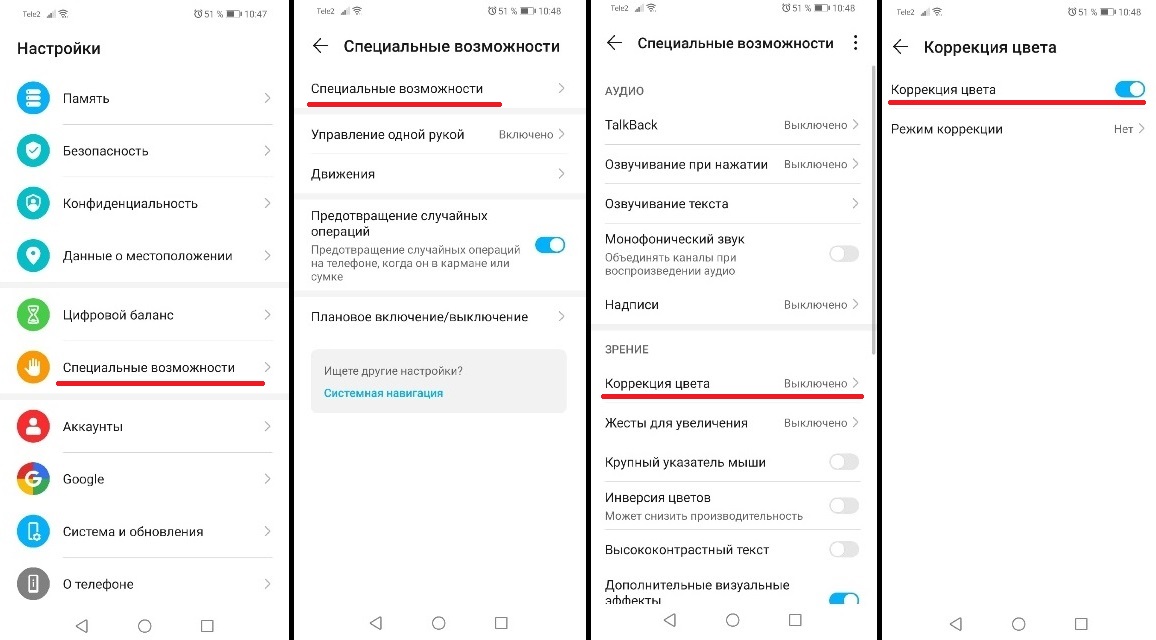 - После чего подпункт «Коррекция цвета». Здесь маркер должен быть в активном положении. Активация опции «Коррекция цвета» предназначена для людей с проблемами зрения. Данная функция улучшает работоспособность гаджета.