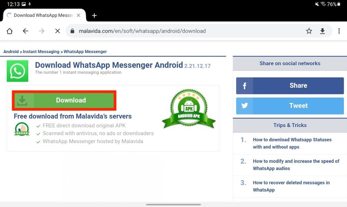 Возможна установка WhatsApp через установочный файл или APK на планшет. Для его получения воспользуйтесь ссылкой на этой странице. Когда вы находитесь на вкладке WhatsApp в Malavida, нажмите Загрузить.