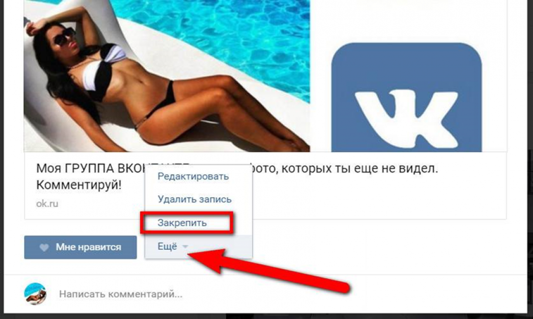 - Осталось только поделиться записью, нажав на кнопку «отправить» и закрепить запись. Это сделать очень просто, когда записью вы уже поделитесь, после времени выкладывания вы увидите светлый значок кнопки/невидимки, или нажать на время добавление записи, где засветиться функция «ещё», нажимаете на неё. Тогда засветиться табличка с остальными предложенными функциями, из которых вы должны будете выбрать «закрепить». Теперь это запись будет первой, которую увидит ваш гость.