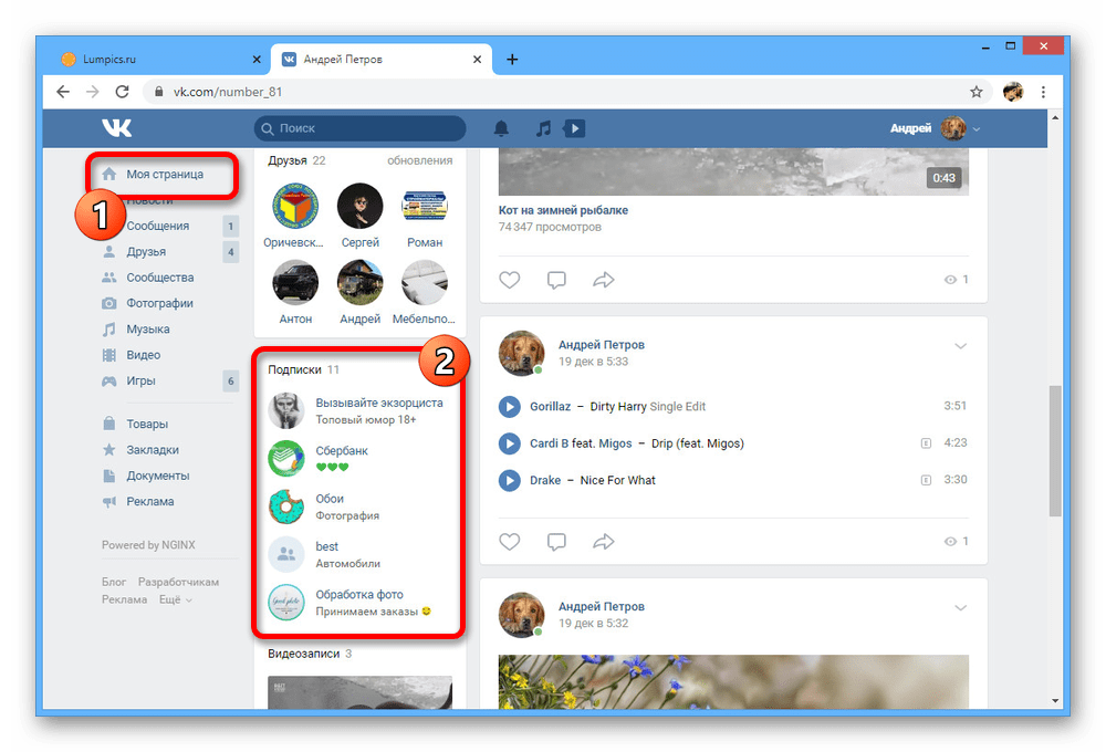 - Помимо обновлений конкретных людей, вы можете ознакомиться со списком публичных страниц. Для этого откройте раздел «Моя страница» и кликните левой кнопкой мыши по блоку «Подписки».