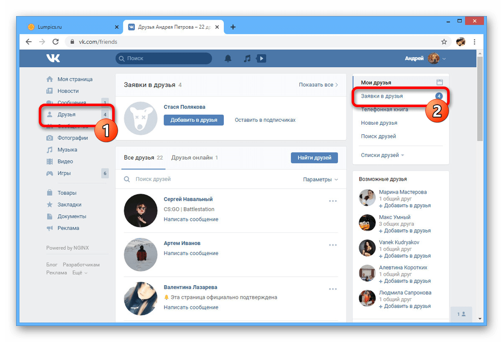 - Через основное меню сайта откройте «Друзья» и перейдите на вкладку «Заявки» в правой части окна браузера.