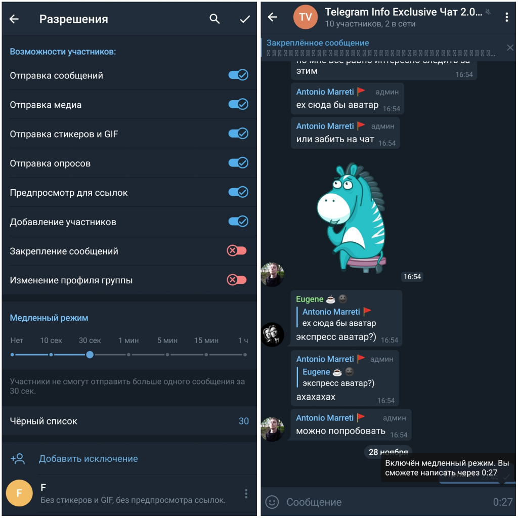 Теперь администраторы чатов могут ограничивать скорость отправления сообщений в ней (аналог Slowmode из Discord). Например: каждый участник группы может отправить только одно сообщение в определенный промежуток времени (не распространяется на администраторов).