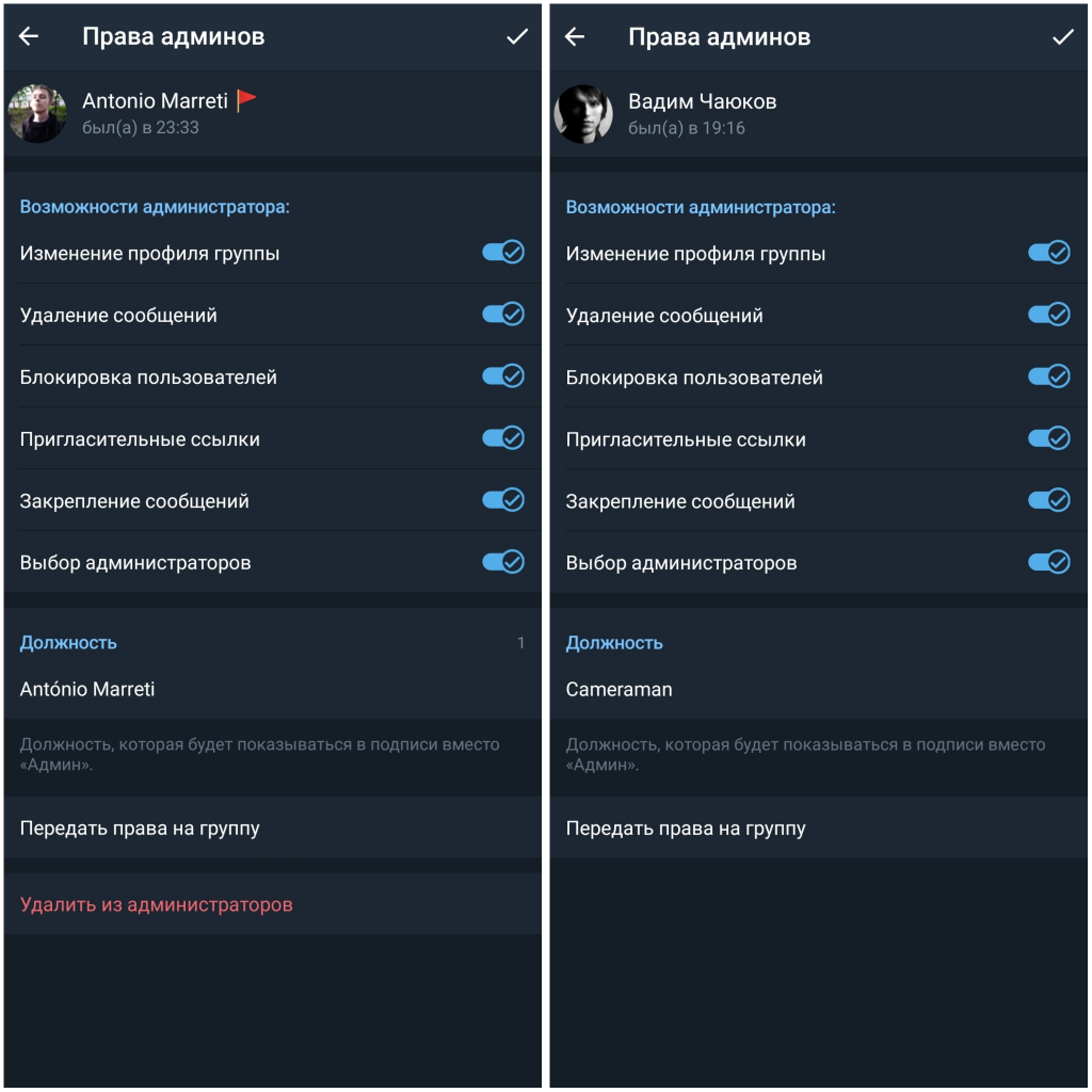 Начиная с версии 5.10, Telegram позволяет собственные роли администраторам в групповых чатах. Например, «Создатель», «главред», «финансовый директор» или «борец со спамом».