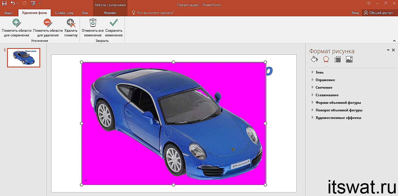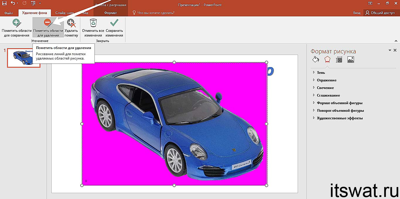 - Сверху выбирайте вкладку «формат» и нажимайте первую кнопку «удалить фон».