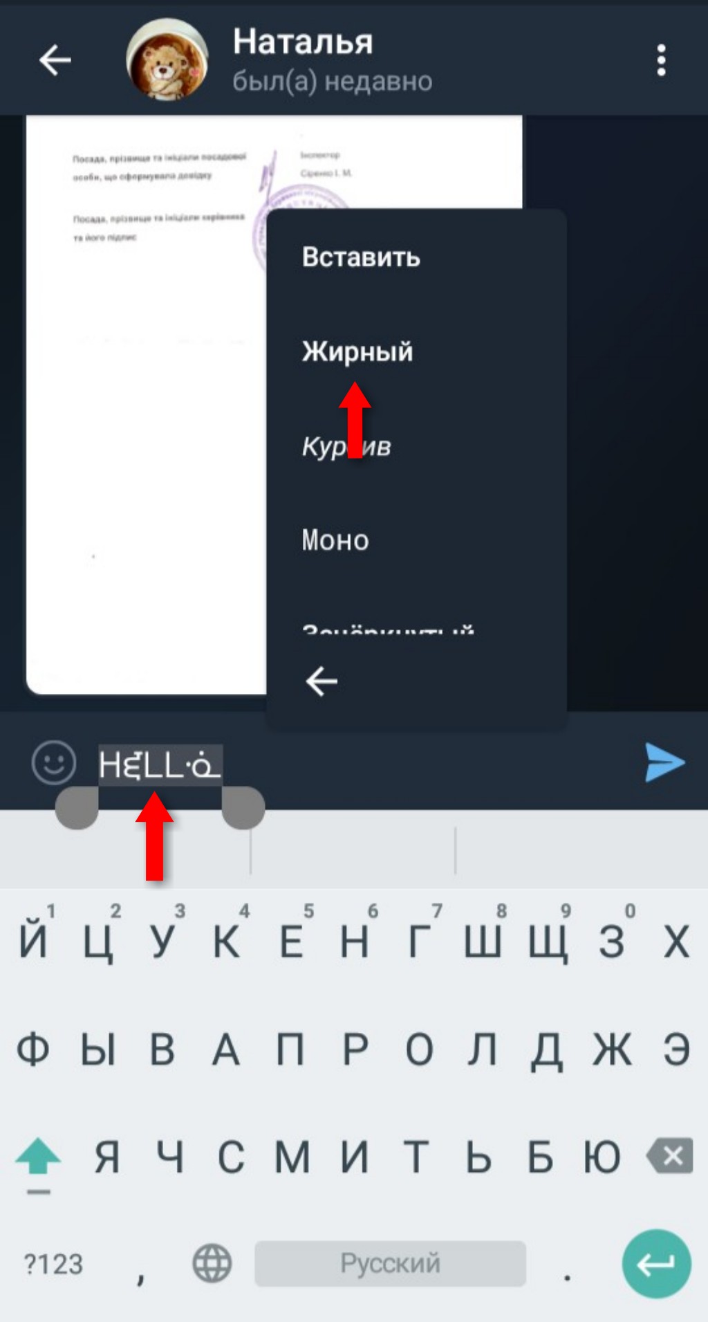 Наиболее лёгкий способ — воспользоваться стандартным встроенным редактором в Телеграме. Войдите в любой чат и напишите фразу, выделите её и кликните на три вертикальные точки, появившиеся в окне для редактирования.