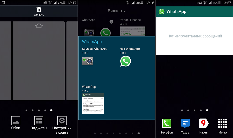 Еще один вариант, как в Ватсапе читать сообщения незаметно – поставить виджет на рабочий стол. С его помощью можно видеть все последние чаты, однако они будут отображаться не полностью.