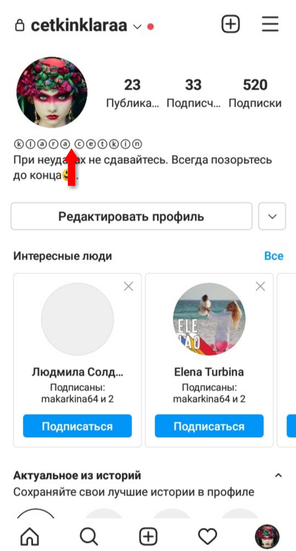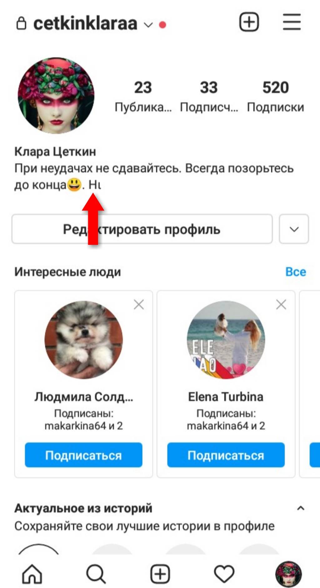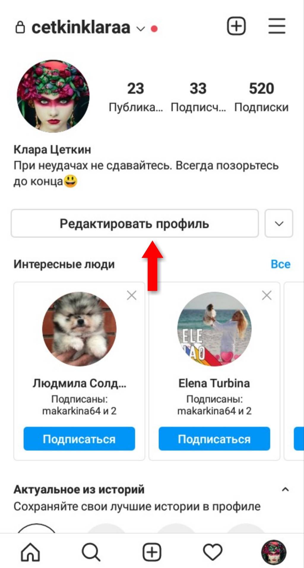 После копирования изменённых слов в буфер обмена войдите в свой профиль Instagram и нажмите «Редактировать профиль».