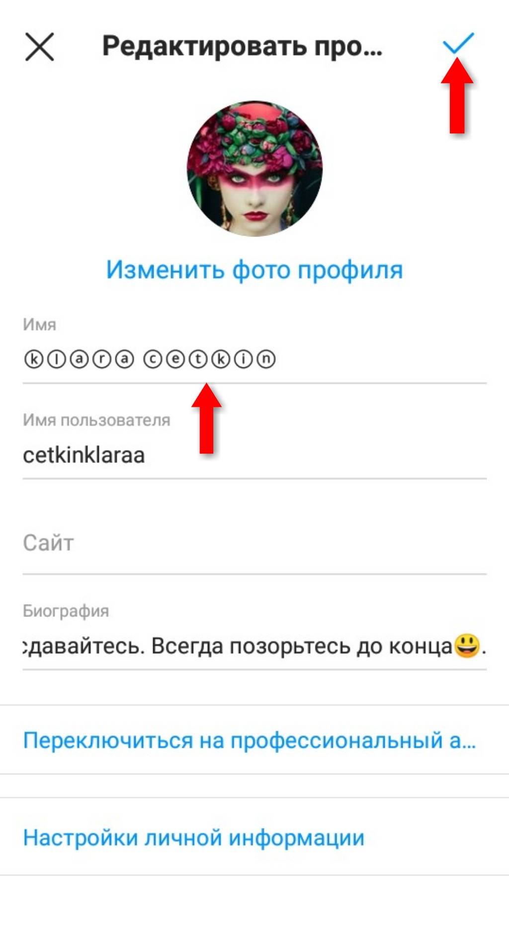Как поменять шрифт в информации о себе