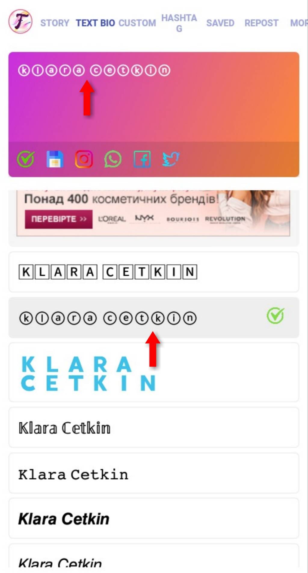 Теперь нужно ввести слово или фразу латиницей в текстовое поле. После ввода выбирайте любой из представленных шрифтов и нажимайте на него.
