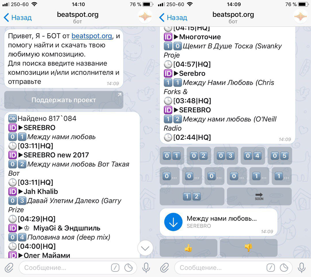 Как видите, запустить бота Телеграм для прослушки музыки из ВК очень просто – а работают они, на удивление, шустро и без лагов. К слову, разумеется, все это не разрешено официально, и скачивая таким образом треки, вы нарушаете авторские права их обладателей. Но кого это сегодня волнует? Во всяком случае, мы вас предупредили.