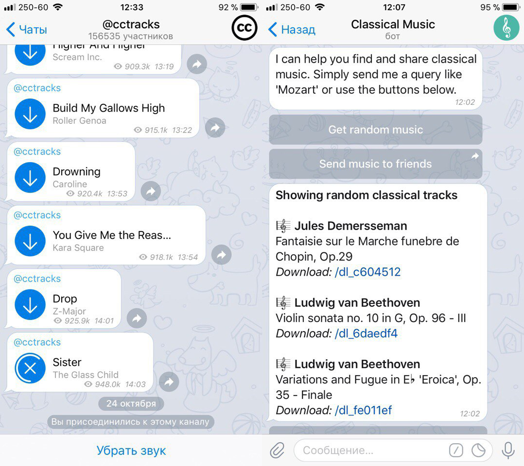 Как было сказано выше, можно создать свой собственный канал, в который загружать интересующие вас композиции, чтобы после их слушать. Но гораздо удобнее пользоваться уже созданными каналами и ботами с большой библиотекой загруженных композиций. Рассмотрим наиболее популярные каналы и ботов.