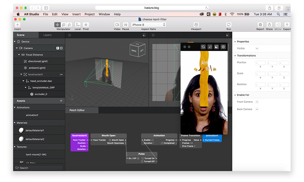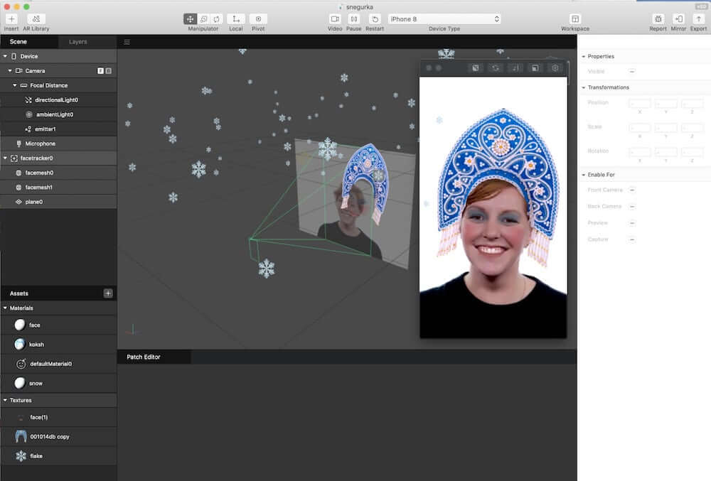 Техническая реализация выглядит так: нажмите «Insert > Scene Understanding > Face Tracker, далее Insert > 3D objects > Face Mesh». Настройте на лице разметку.