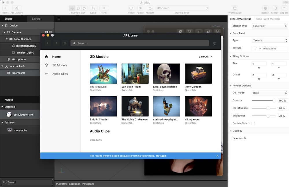 Запустите Spark AR Studio. Вас встретит набор предустановленных эффектов и масок — на их примере можно посмотреть некоторые принципы работы. Но изменять пресеты нужно аккуратно: обычно это рушит установленные зависимости объектов, и маска может заработать неверно.