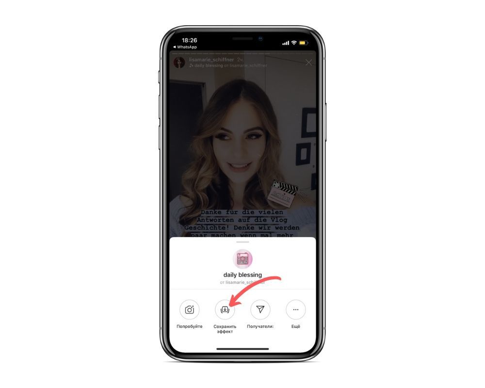 Чтобы забрать ее себе – нажмите на кнопку со стрелкой, как указано на скриншоте выше. Приложение уведомит вас о том, что эффект сохранен в камере. Теперь можно пользоваться ею в своих сторис в любое время.