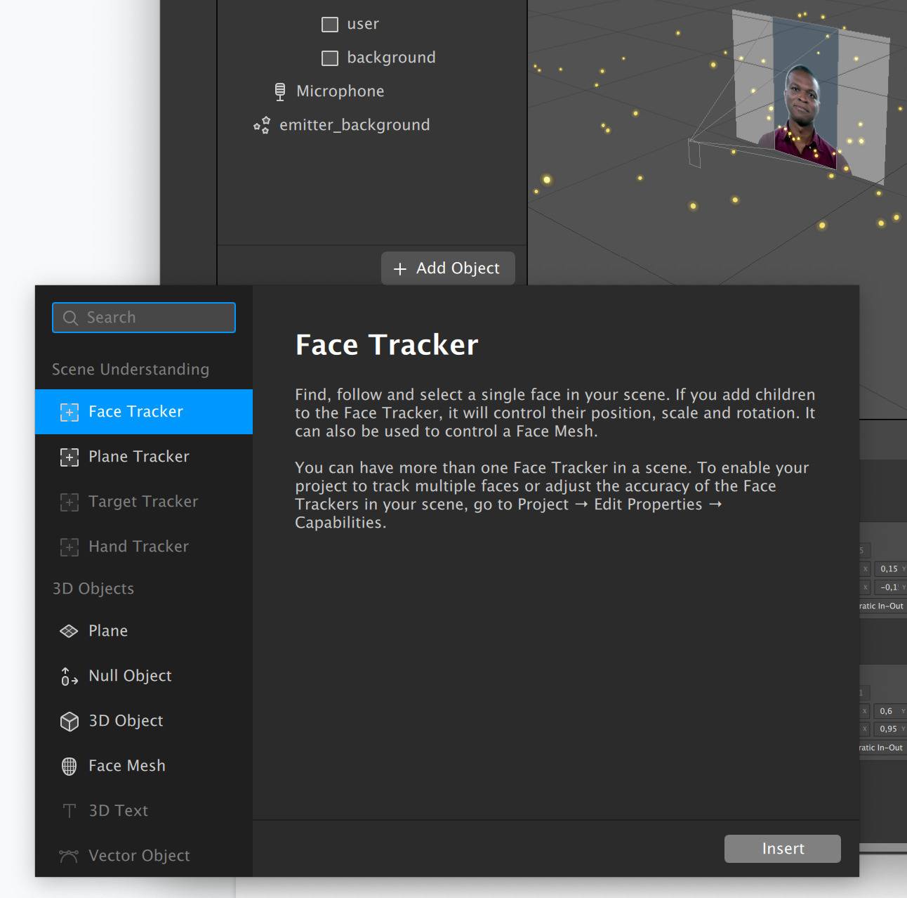 Далее перейдите в рабочее пространство для создания маски — Insert → Scene. Вы будете работать с функциями FaceTracker и FaceMesh. Первая отслеживает движение лица и мимику, вторая — 3D-объект, который синхронизируется с трекером и содержит ваши текстуры с эффектами.