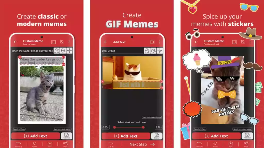 Создатель мемов, акцентирующий внимание на современных шутках, а не на тех, что устарели несколько веков назад. В приложении более 500 популярных шаблонов, экспорт напрямую, рисование пальцем и никаких водяных знаков! Также в программе есть темный режим, поиск примеров картинок в Google, раздел «Любимые мемы», множество пользовательских стикеров и автоматический импорт шаблонов из Reddit