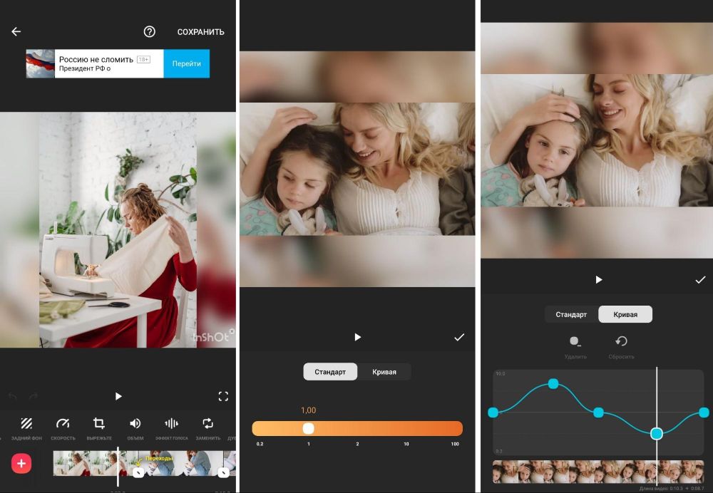 inShot – простой в управлении, но при этом достаточно продвинутый редактор. Создавать ускоренные видеозаписи здесь можно в двух режимах: упрощенный – потребуется передвинуть бегунок на слайдере; и сложный – с помощью кривых. Первый вариант накладывает изменения на весь фильм, второй способ позволяет настраивать отдельные участки без обрезки. Высший параметр достигает 100.