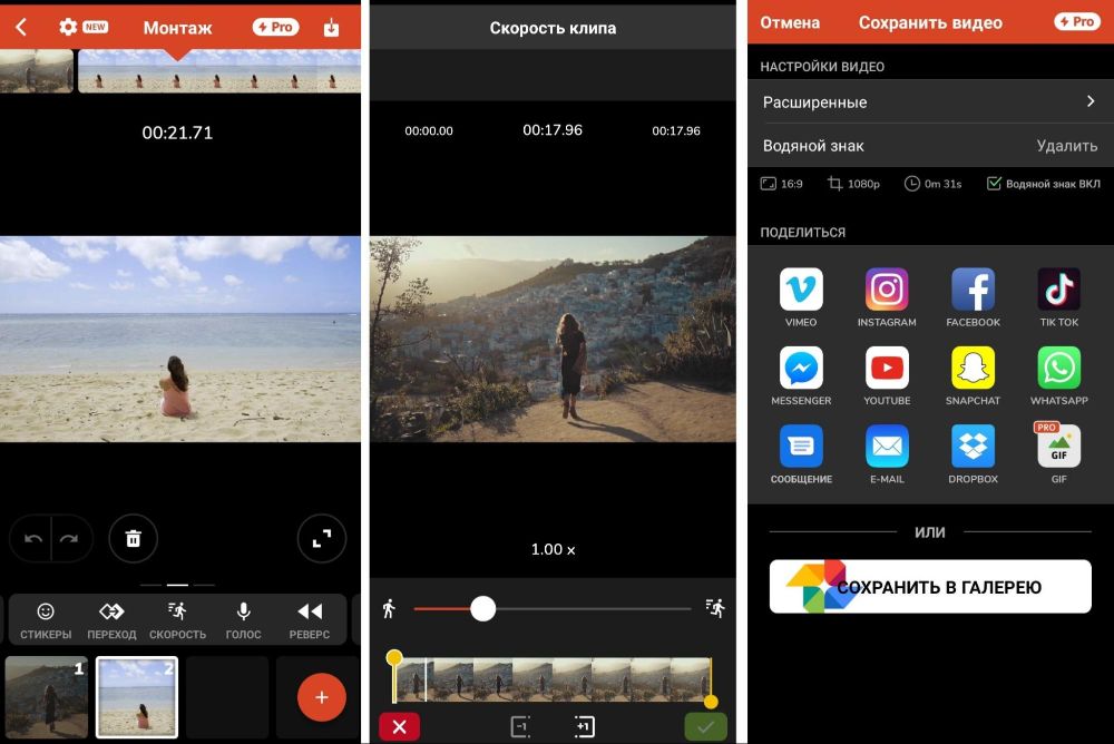 Movavi Clips – мобильная версия десктопной программы на ПК. Бесплатный вариант программы имеет много настроек. Очень удобно удалять ненужные фрагменты, соединять разные файлы, накладывать музыку, озвучивать, редактировать световые настройки, скорость и другое.
