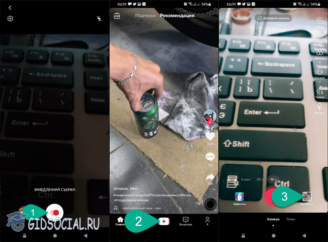 - При помощи соответствующей кнопки запускаем запись. Когда создание видеоролика будет завершена, снова переходим в приложении TikTok для того, чтобы опубликовать клип. Функционал социальной сети позволяет не только снимать видео, но и загружать уже готовые материалы. Для этого нам понадобится иконка, обозначенная на скриншоте ниже цифрой «3».