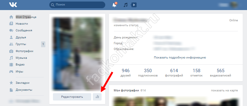 Этот способ подойдёт только тем аккаунтам, в которых больше 100 подписчиков и работает он только в онлайн версии соцсети. У таких пользователей под аватаркой появляется кнопка с диаграммой — «Статистика посещаемости»