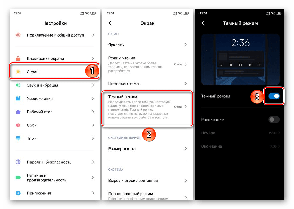 Многие производители, разрабатывающие не только смартфоны, но и собственные варианты ОС Android, реализовали темную тему либо еще до того, как это сделали Google, либо одновременно с ними, но более качественно. В числе таковых OnePlus (Oxygen OS), Xiaomi (MIUI), Huawei и Honor (EMUI), а также некоторые другие. Включение интересующего нас варианта оформления в них выполняется по тому же алгоритму, что и в рассмотренном выше случае – достаточно обратиться к настройкам экрана и выбрать соответствующий режим.