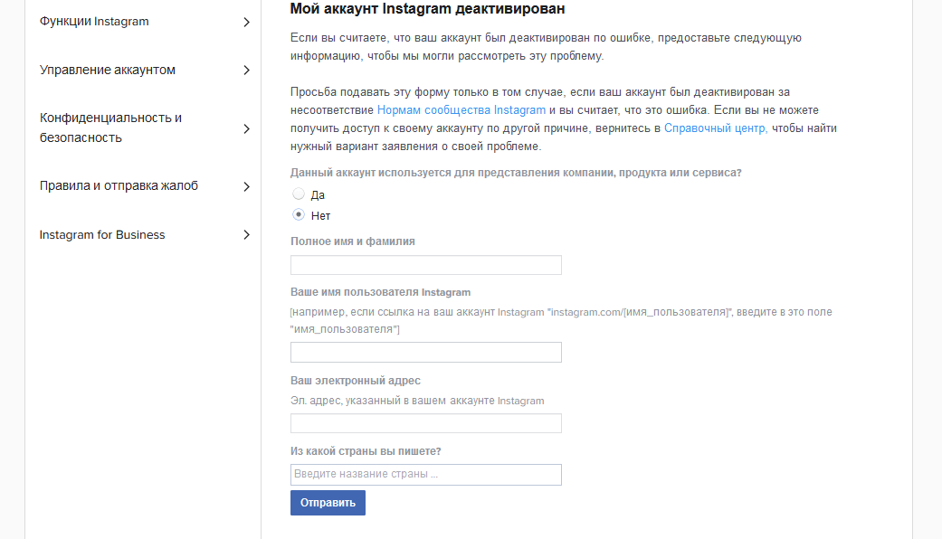 Добрый день! Я владелец аккаунта. Вероятнее всего, мой аккаунт заблокировали из-за системной ошибки или косвенного нарушения правил. Прошу учесть, что на моей странице опубликованы полезные материалы. Они помогали развитию Instagram*. Пожалуйста, разблокируйте мой аккаунт. Я обязуюсь внимательней относиться к правилам и не нарушать их.