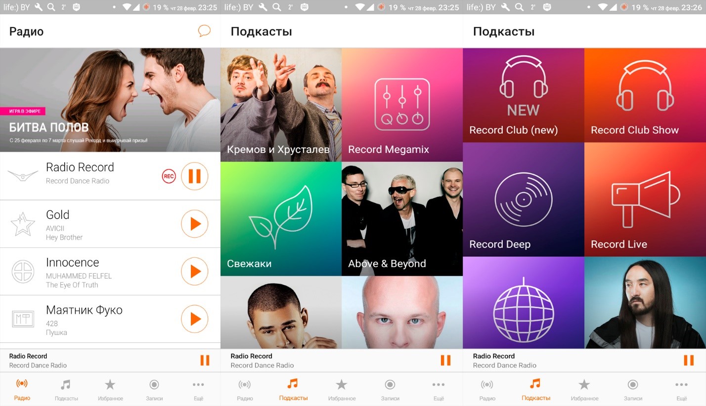 Присутствует удобная каталогизация по исполнителям. Есть также специальный раздел «Подкасты», где исполнители рассказывают пользователям о весьма интересных штуках. Как бы то ни было, «Радио Рекорд» — полезная вещь для тех, кто любит «электронщину».